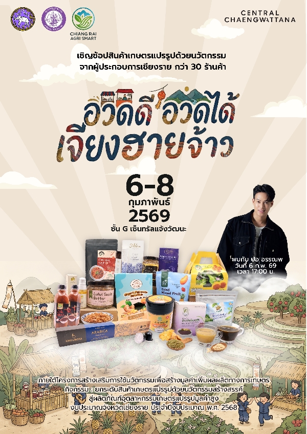 อย่าพลาด!!!! ช้อป ชิม สินค้าดาวเด่นจากจังหวัดเชียงรายในงาน “อวดดี อวดได้ เจียงฮายจ้าว”ระหว่างวันที่ 6-9 กุมภาพันธ์ 2569 เวลา 10.30 – 22.00 น. ณ บริเวณ ลานโปรโมชั่น PGA ชั้น G เซ็นทรัลแจ้งวัฒนะ อำเภอปากเกร็ด จังหวัดนนทบุรี
