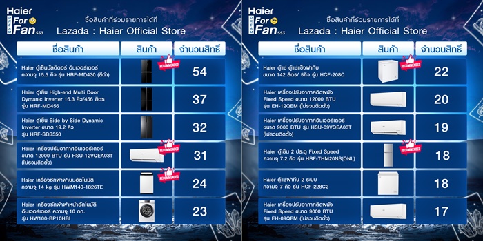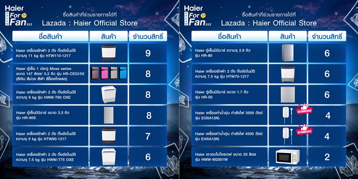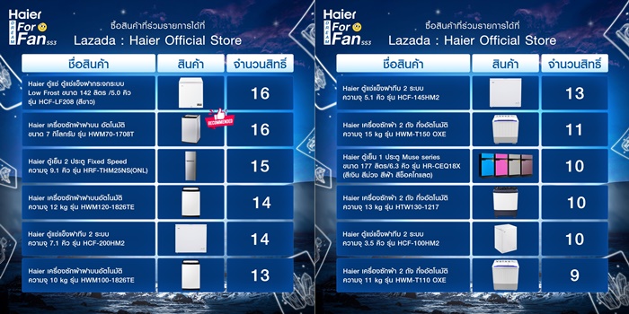 - ซื้อสินค้าไฮเออร์ที่ร่วมรายการเพื่อสะสมสิทธิ์ Lucky Draw ผ่านช่องทาง Lazada Haier Official Store : https://www.lazada.co.th/shop/haier