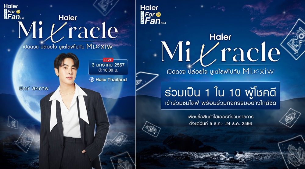 ไฮเออร์ แบรนด์เครื่องใช้ไฟฟ้าภายในบ้านอันดับ 1 ของโลกติดต่อกัน 14 ปีซ้อน ชวนทุกคนมาร่วมเป็นส่วนหนึ่งของความทรงจำอันแสนวิเศษไปกับ มิกซ์ สหภาพ วงศ์ราษฎร์ ที่จะมาเป็นแขกคนพิเศษร่วมทำกิจกรรมสนุกๆ แฮปปี้รับต้นปีแบบปังๆ ในกิจกรรม Haier Dream For Fan SS3 “Haier Mixracle เปิดดวง ปล่อยใจ มูเตไลฟ์ไปกับ Mixxiw” อีกทั้งจะนำพาเราทุกคนไปพบกับความมหัศจรรย์รับปีใหม่ และสัมผัสช่วงเวลาดั่งต้องมนต์สะกด พร้อมเสริมพลังความโชคดีผ่าน Live บน Facebook: Haier Thailand ในวันที่ 3 ม.ค. 2567 เวลา 18.00 น.