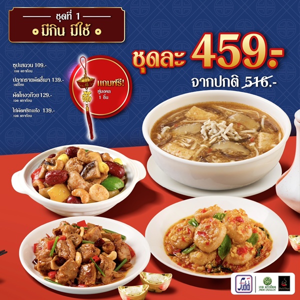 ชุดที่ 1 “มีกิน มีใช้” – ราคา 459 บาท (จากปกติ 516 บาท) เน้นความคุ้มค่า แต่ยังเปี่ยมด้วยคุณค่าโภชนาการและความหมายที่ดี ประกอบด้วย ซุปเสฉวน ปลากรายผัดขี้เมา ผัดโหงวก๊วย และไก่ผัดพริกแห้ง