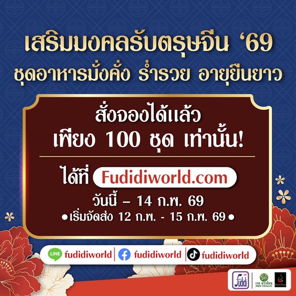 รีบด่วน! จำนวนจำกัดเพียง 100 ชุดเท่านั้น มาร่วมฉลองตรุษจีนด้วยอาหารระดับภัตตาคารในบ้านของคุณเอง สามารถสั่งจองความอร่อยพร้อมสิริมงคลสุดเฮงตั้งแต่วันนี้ – 14 กุมภาพันธ์ 2569 ได้ที่ Fudidiworld.com หรือผ่านทาง LINE Official Account: @fudidiworld ส่งฟรีในเขตกรุงเทพฯ และปริมณฑล