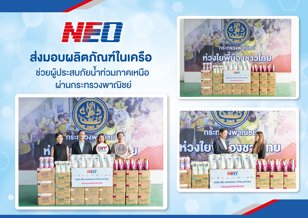 บริษัท นีโอ คอร์ปอเรท จำกัด (มหาชน) ผู้ผลิตและจัดจำหน่ายสินค้าอุปโภคสัญชาติไทยคุณภาพระดับมาตรฐานสากล ร่วมส่งมอบความช่วยเหลือเพื่อบรรเทาความเดือดร้อนแก่พี่น้องผู้ประสบอุทกภัยในพื้นที่ภาคเหนือ โดย นายชวลิต รัตนเสรีชัย ผู้อำนวยการฝ่ายกิจการองค์กร เป็นผู้แทนบริษัทฯ มอบผลิตภัณฑ์ ไฟน์ไลน์ซักผ้าสูตรเข้มข้น, ดีนี่ ผลิตภัณฑ์ปรับผ้านุ่ม สูตรเข้มข้นพิเศษ, โทมิ ผลิตภัณฑ์ทำความสะอาดห้องน้ำ และโทมิ ผลิตภัณฑ์ทำความสะอาดพื้น สูตรลดฝุ่น ให้แก่กระทรวงพาณิชย์ เพื่อนำไปจัดทำถุงยังชีพส่งต่อไปยังผู้ประสบภัย เมื่อเร็วๆ นี้