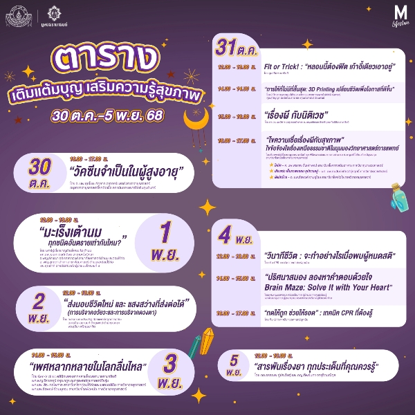 พฤหัสบดีที่ 30 ต.ค. เติมแต้มบุญ เสริมความรู้สุขภาพในวันเปิดงาน