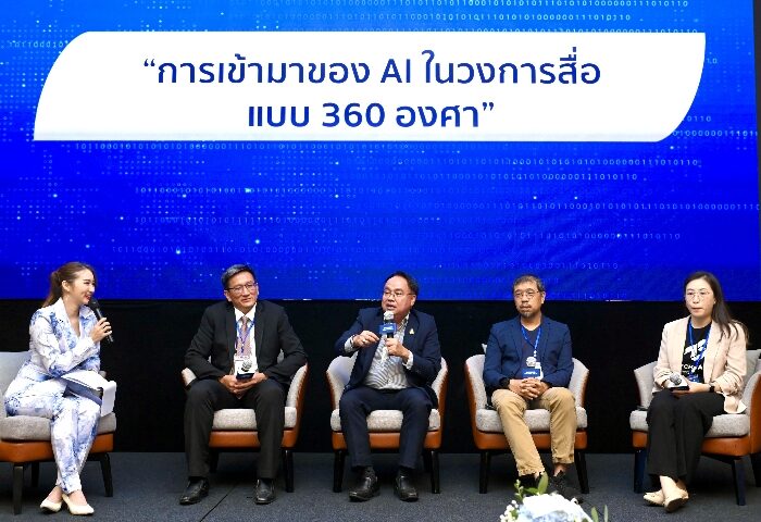 เสวนาหัวข้อ“การเข้ามาของ AI ในวงการสื่อแบบ 360 องศา โดย ดร.ธนกร ศรีสุขใส ผู้จัดการกองทุนพัฒนาสื่อปลอดภัยและสร้างสรรค์, ผศ.ดร. สุกรี สินธุภิญโญ กรรมการสมาคมปัญญาประดิษฐ์ประเทศไทย (AIAT) อาจารย์คณะวิศวกรรมศาสตร์ จุฬาลงกรณ์มหาวิทยาลัย, นายนพ ธรรมวานิช กรรมการสมาคมผู้ประกอบการแอนิเมชั่นและคอมพิวเตอร์ กราฟฟิกส์ไทย (TACGA) อาจารย์คณะดิจิทัลมีเดียและศิลปะภาพยนตร์ มหาวิทยาลัยกรุงเทพ และนางสาวภาพเพรง เลี้ยงสุข Program Director บริษัท เทคซอส มีเดีย จํากัด